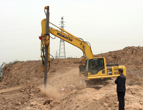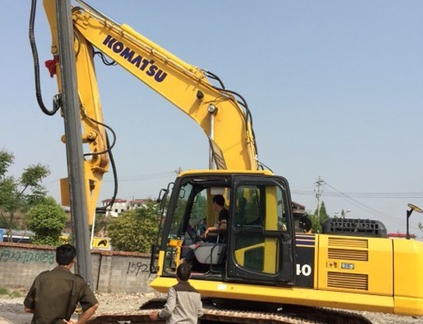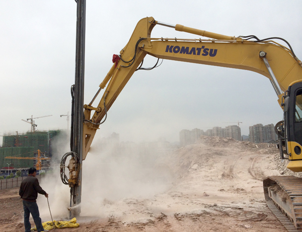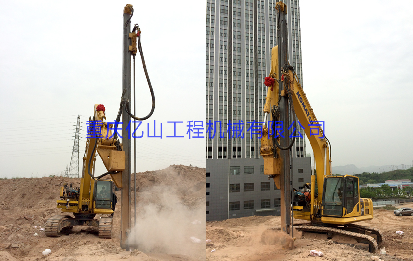 2、前后左右自由伸展,當(dāng)挖掘機(jī)在工地不平坦的情況下, 挖機(jī)手可根據(jù)位置不同調(diào)整鉆桿角度,保持90°垂直鉆孔。