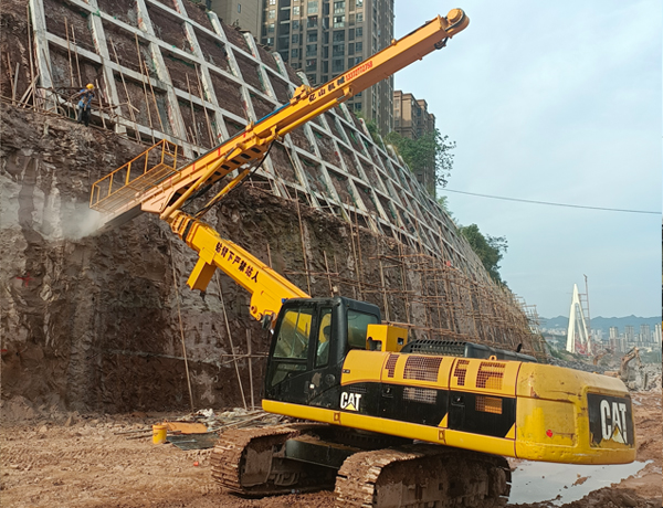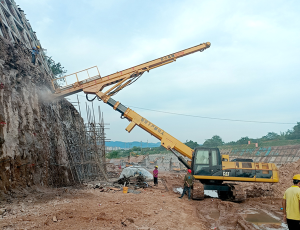 3、作業半徑擴大化 。因為挖掘機小臂不拆,它的作業半徑可以延長作業半徑2-3米,且仰角打孔、水平打孔、豎直打孔都可以實現。